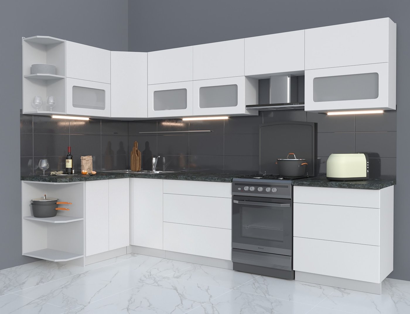 угловая, длина 310 см, ширина 150 см, каркас ЛДСП, фасад МДФ пленочный, установка мойки: врезная мойка, ширина шкафа под мойку 98 см
