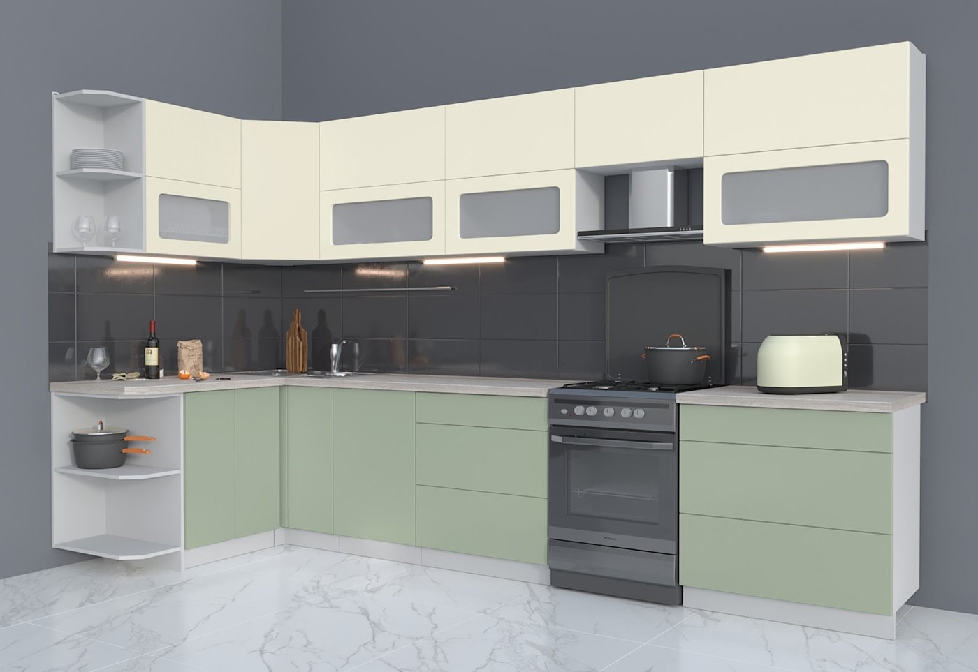 Готовая кухня Интерлиния Мила Матте 1.5x3.5 Б левая (слоновая кость/мята/травертин сер.)