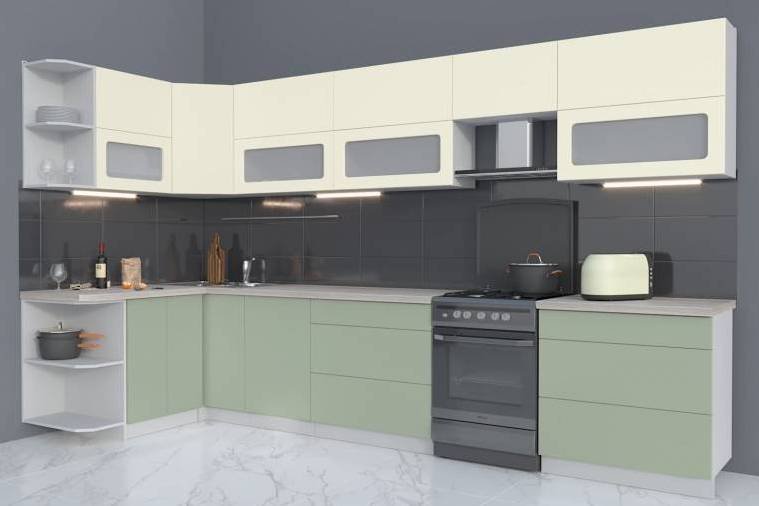 Готовая кухня Интерлиния Мила Матте 1.5x3.6 Б правая (слон кость-мята-травертин серый)