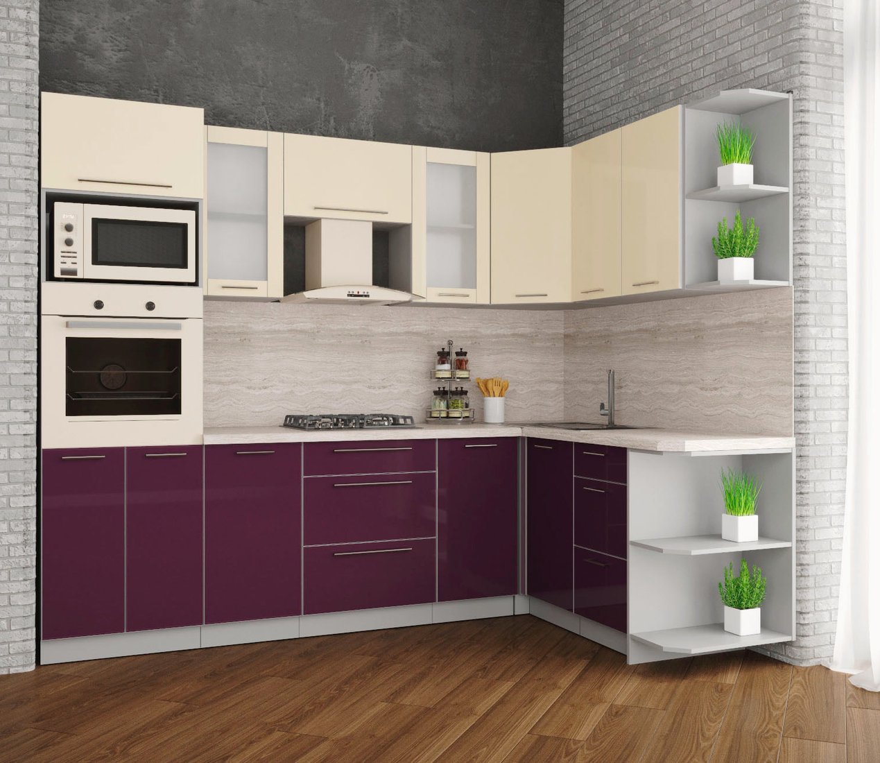 Готовая кухня Интерлиния Мила Пластик 1.68x2.6 правая (ваниль глянец/слива/травертин с.)