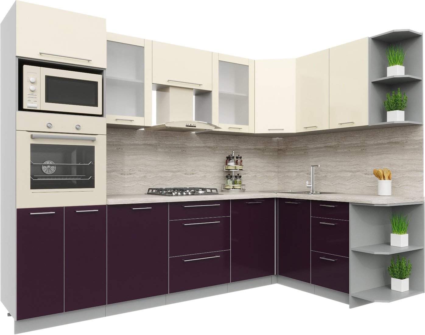 Готовая кухня Интерлиния Мила Пластик 1.68x2.8 правая (слива/ваниль глянец/травертин серый)
