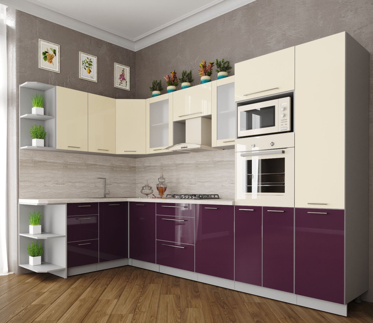 Готовая кухня Интерлиния Мила Пластик 1.68x3.2 правая (ваниль глянец/слива/травертин с.)