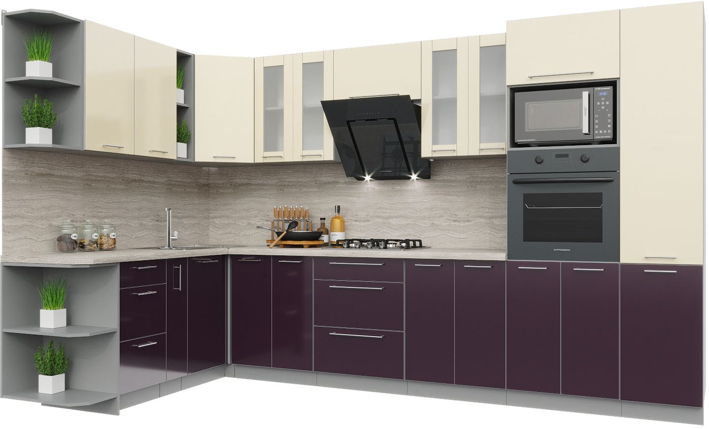 Готовая кухня Интерлиния Мила Пластик 1.88x3.4 левая (слива/ваниль глянец/травертин серый)