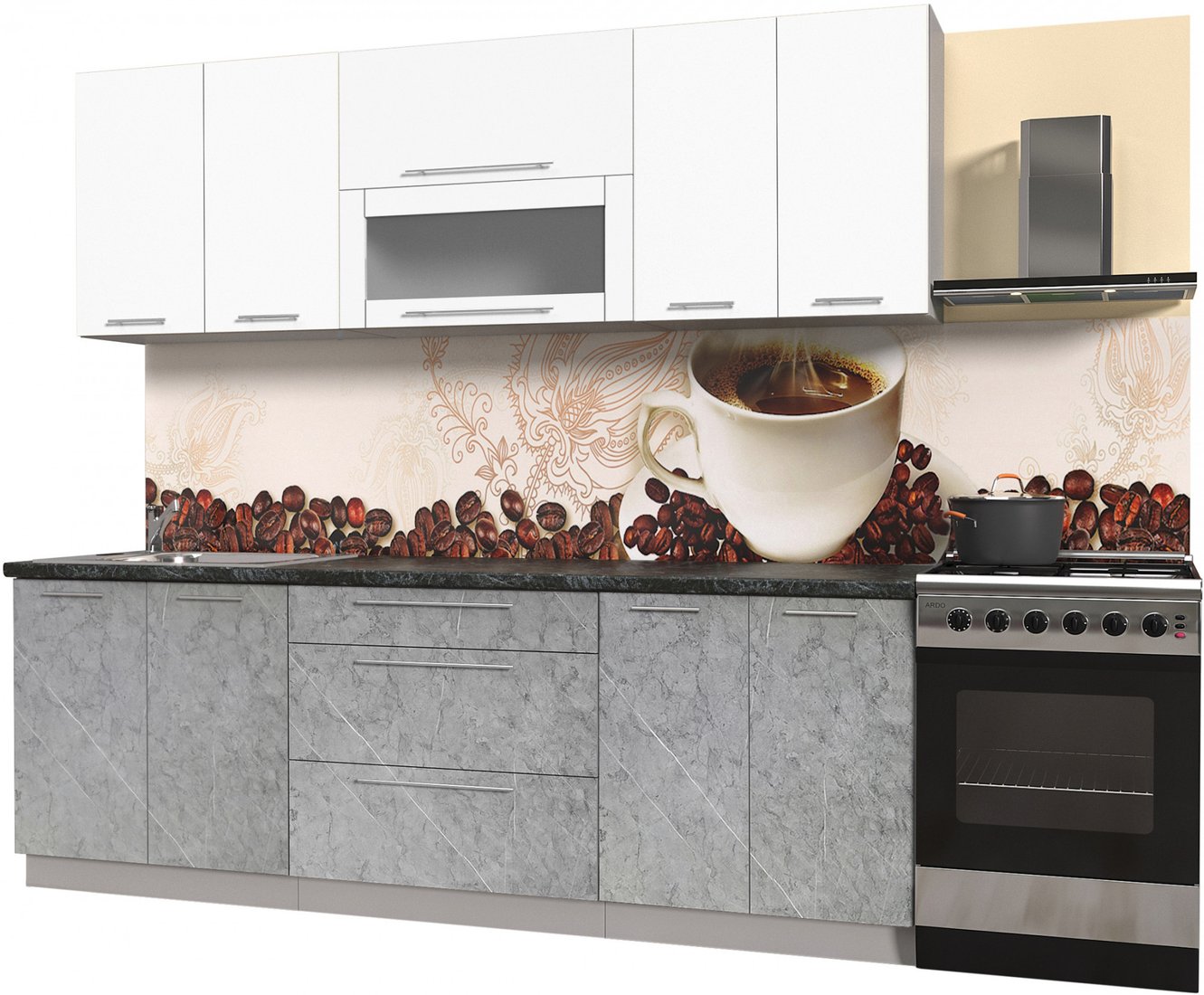 линейная, длина 230 см, ширина 60 см, каркас ЛДСП, фасад МДФ крашеный, установка мойки: врезная мойка, ширина шкафа под мойку 80 см