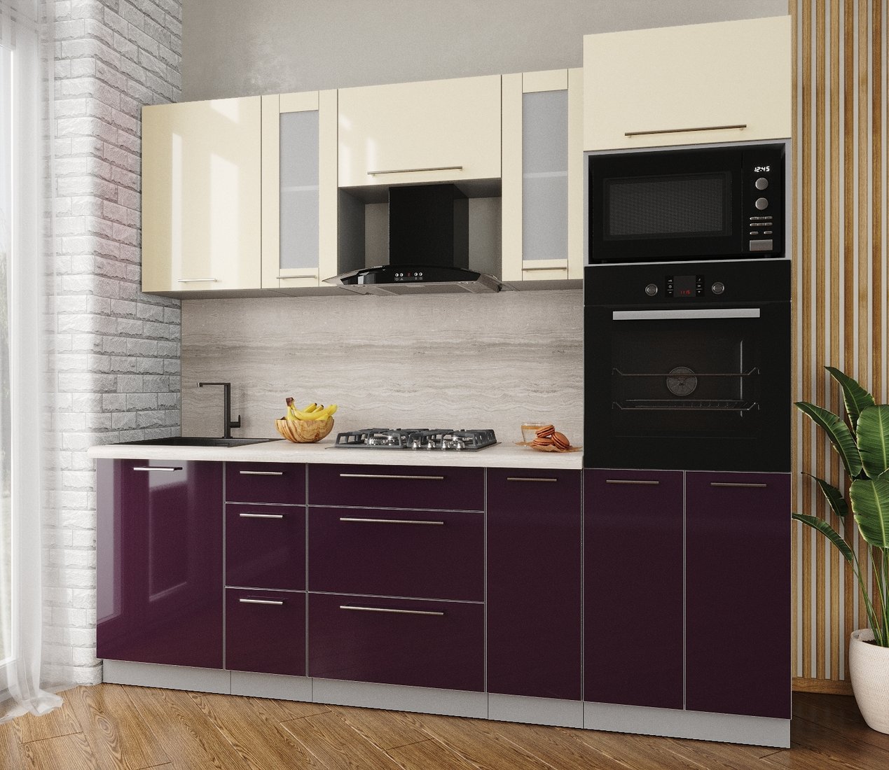 Готовая кухня Интерлиния Мила Пластик 2.3 (слива/ваниль глянец/травертин серый)