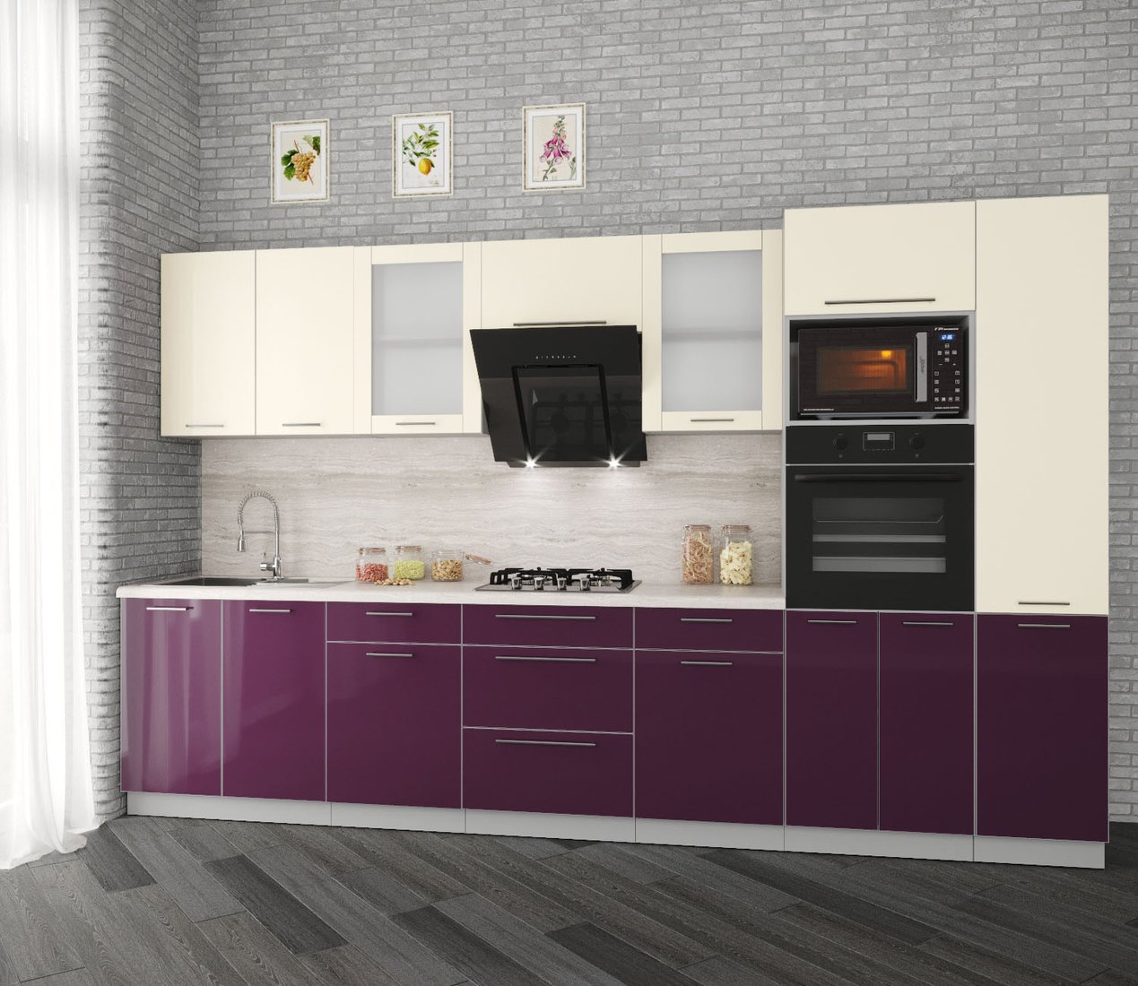 Готовая кухня Интерлиния Мила Пластик 3.4 (слива/ваниль глянец/травертин серый)