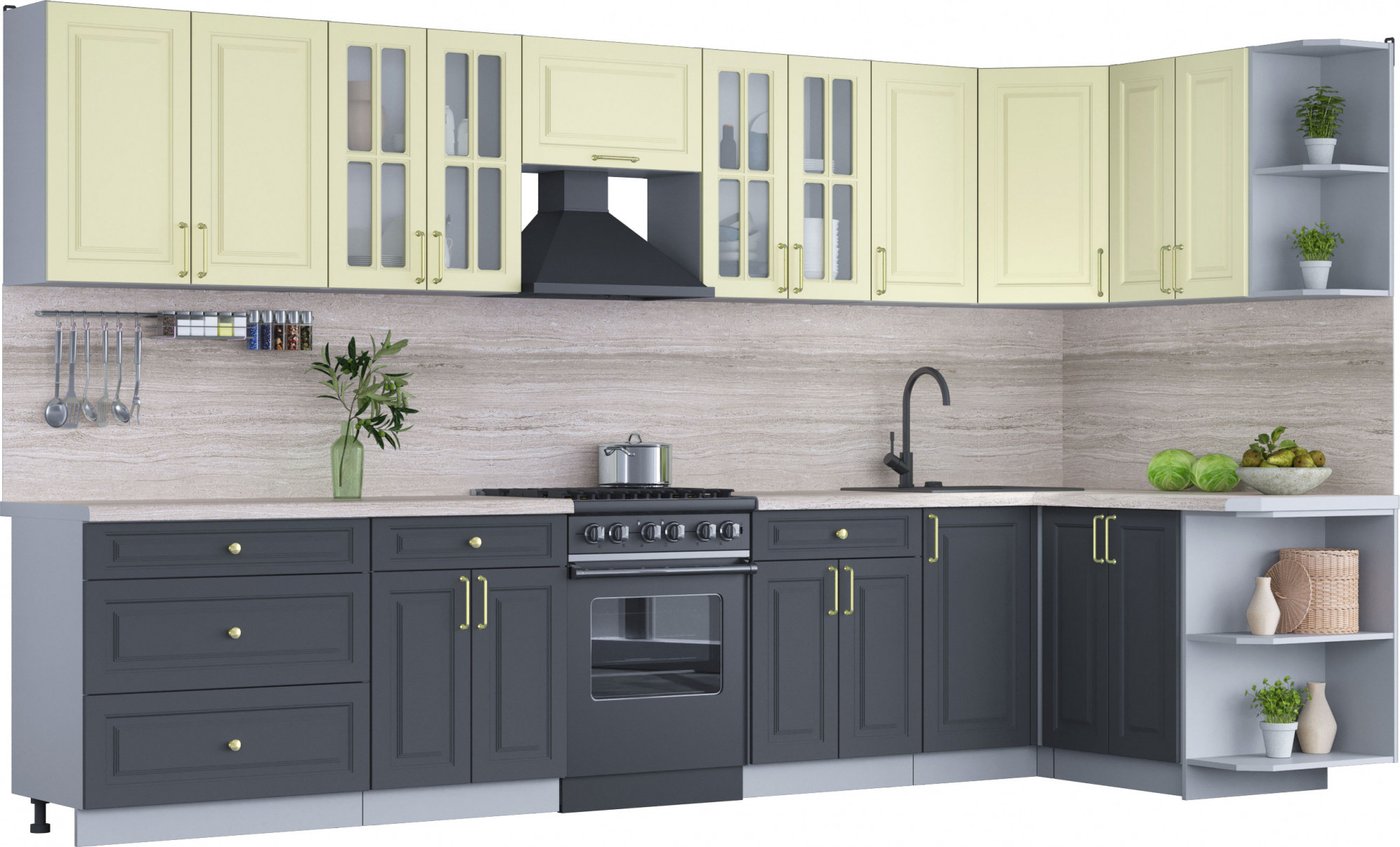 Готовая кухня Интерлиния Мила Шато 1.5x3.6 правая (слоновая кость/пепел/травертин серый)