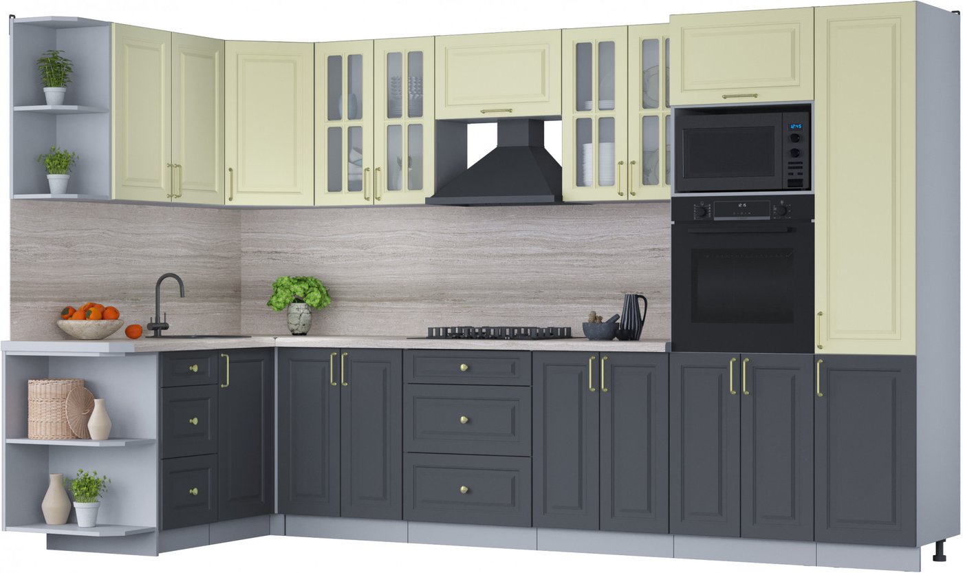 Готовая кухня Интерлиния Мила Шато 1.68x3.4 ВТ левая (слоновая кость/пепел/травертин серый)