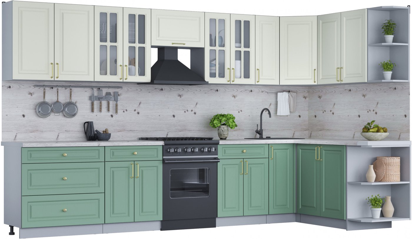 Готовая кухня Интерлиния Мила Шато 1.7x3.5 правая (белый/мята/бискайская сосна)