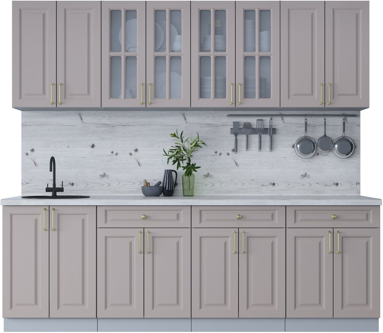 линейная, длина 240 см, ширина 60 см, каркас ЛДСП, фасад МДФ пленочный, установка мойки: врезная мойка, ширина шкафа под мойку 60 см