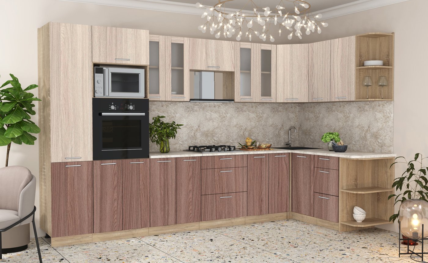угловая, длина 340 см, ширина 168 см, каркас ЛДСП, фасад ЛДСП, установка мойки: врезная мойка, ширина шкафа под мойку 98 см