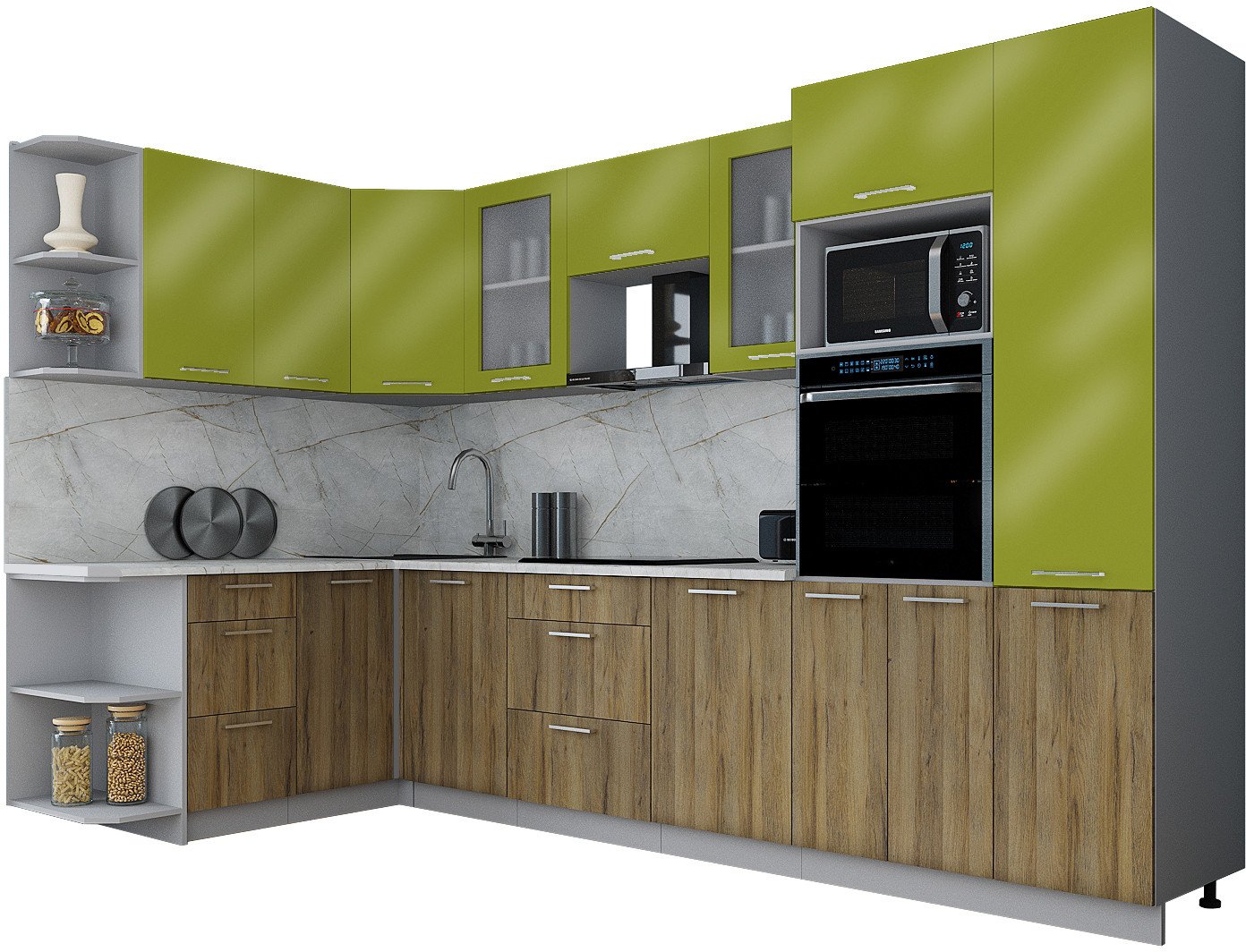 Готовая кухня Интерлиния Мила Gloss 1.68x3.2 левая (яблоко глянец/дуб вотан/травертин серый)