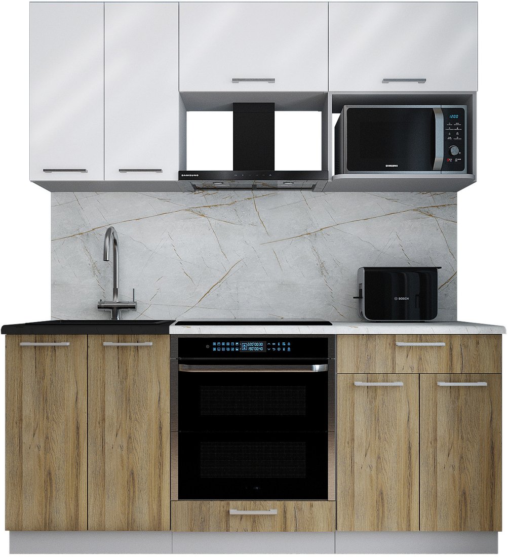 Готовая кухня Интерлиния Мила Gloss 1.8 (белый глянец/дуб вотан/травертин серый)