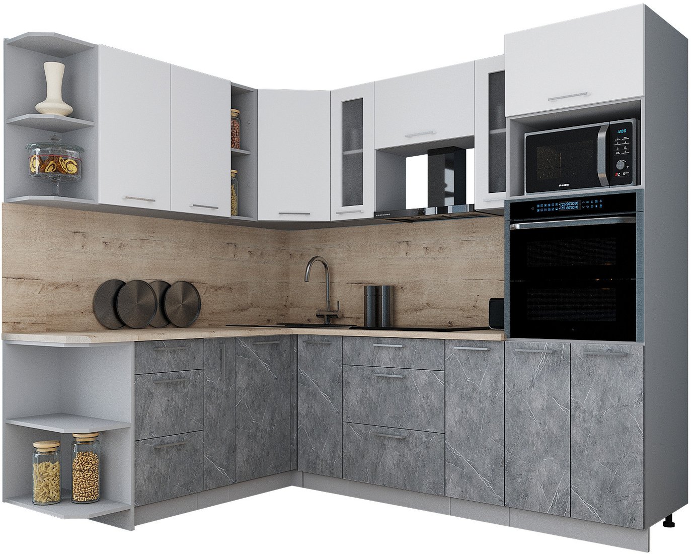 Готовая кухня Интерлиния Мила Gloss 1.88x2.4 левая (белый софт/керамика/травертин серый)