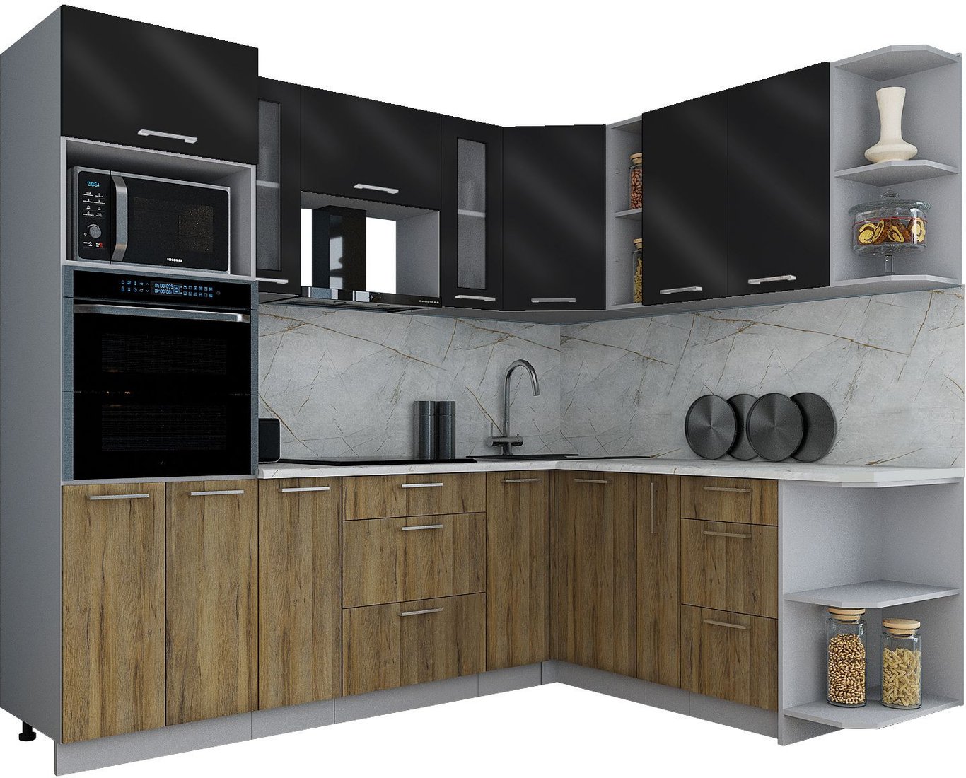 Готовая кухня Интерлиния Мила Gloss 1.88x2.4 правая (черный глянец/дуб вотан/травертин серый)