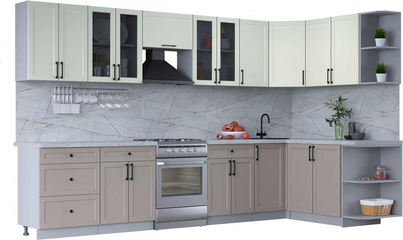 угловая, длина 340 см, ширина 170 см, каркас ЛДСП, фасад МДФ пленочный/стекло, установка мойки: врезная мойка