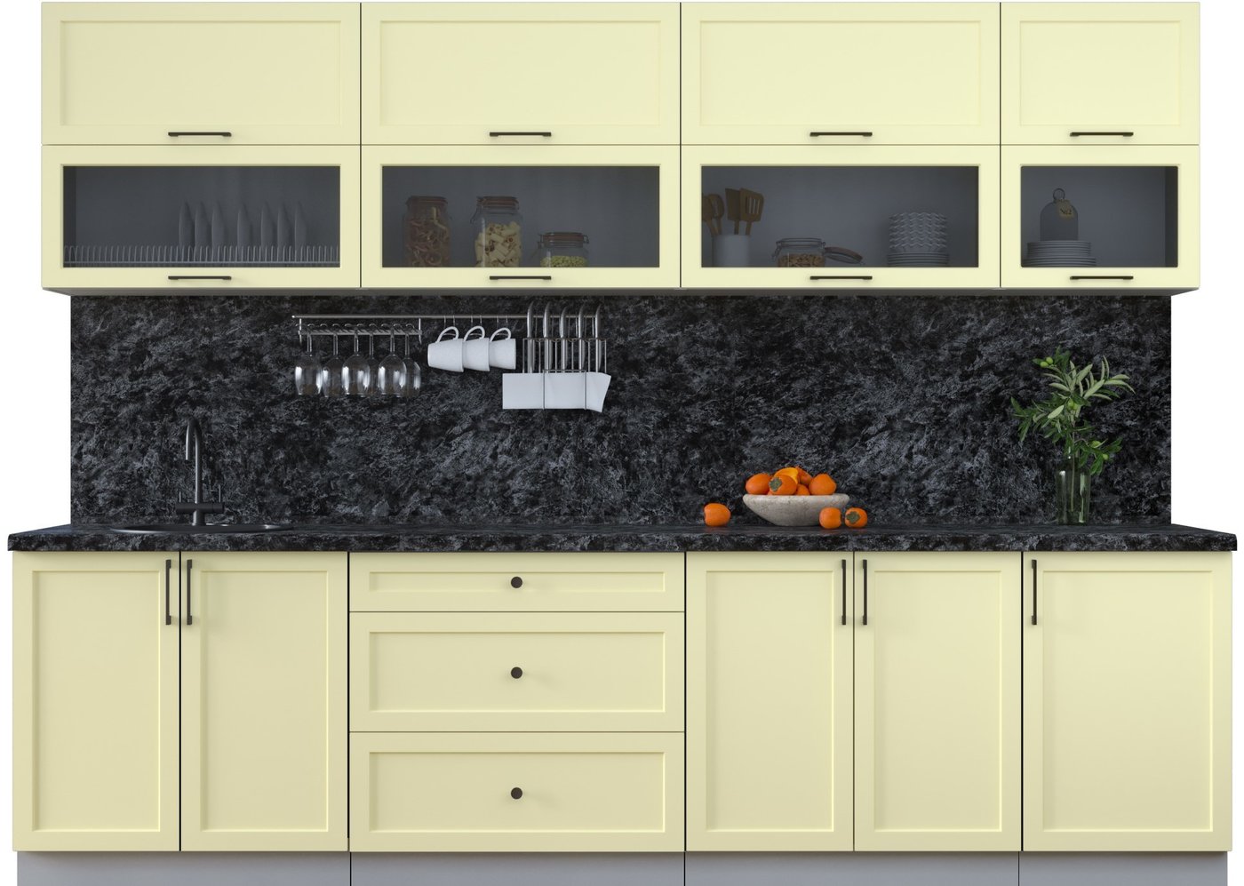 линейная, длина 290 см, ширина 60 см, каркас ЛДСП, фасад МДФ пленочный, установка мойки: врезная мойка, ширина шкафа под мойку 80 см