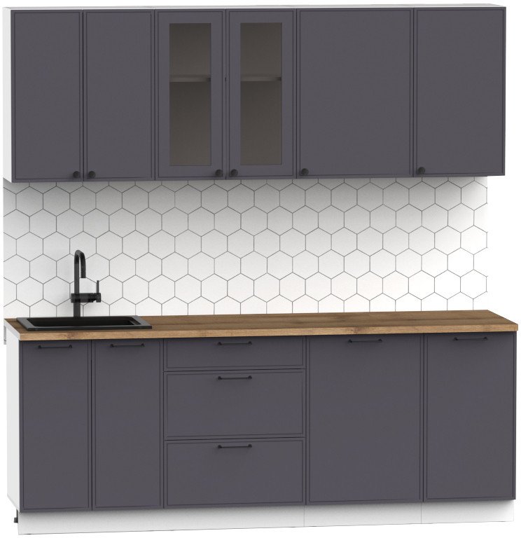 линейная, длина 210 см, ширина 60 см, каркас ЛДСП, фасад МДФ пленочный/стекло, установка мойки: врезная мойка, ширина шкафа под мойку 60 см