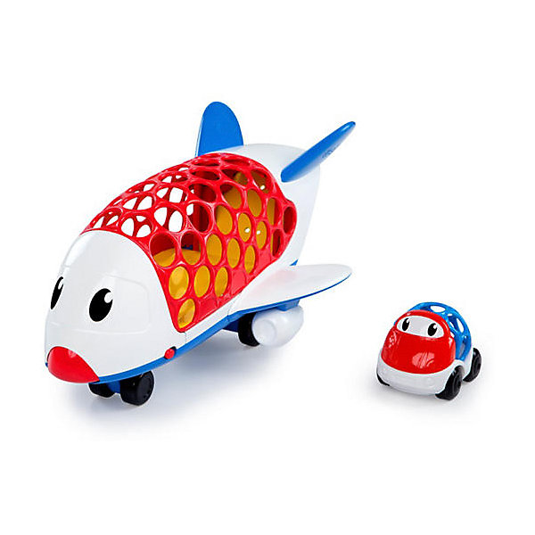 Грузовой самолёт Oball воспроизводит разные звуки при нажатии на нос. В самолете прозрачный фюзеляж, через который видно груз. Чтобы загнать машинку внутрь самолета, нужно открыть задний отсек. Игрушки имеют подвижные колеса и забавные мордочки.