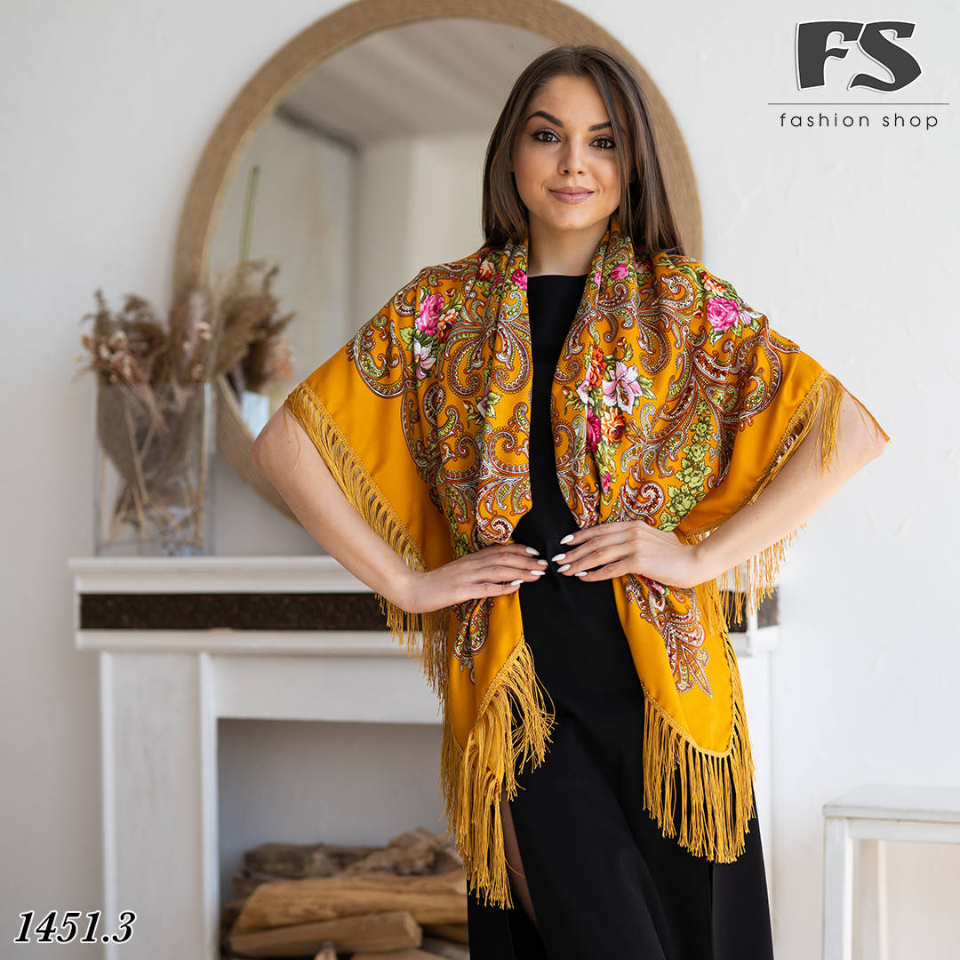 Гірчична народна хустина з густими китицями Гармонія Квітів
