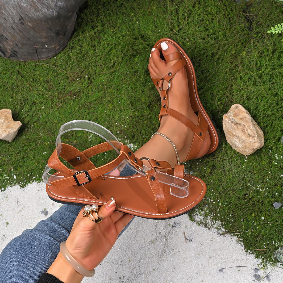 Дамы, Плоская подошва, Сандалии, Пляжная обувь, Нескользящие, Лето, Носок выше колена, Заклепки, Прямой ремешок, Женские сандалии 43 коричневый