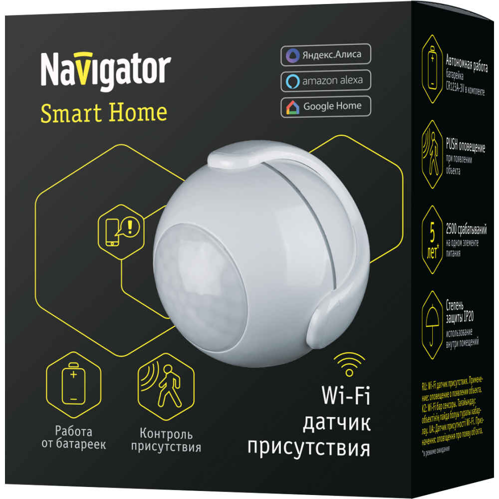Датчик присутствия Navigator NSH-SNR-M01-WiFi Smart Home, с управлением по Wi-Fi, питание CR123A-3V, со световым/PUSH оповещением (14551), NSH-SNR-M01-WiFi