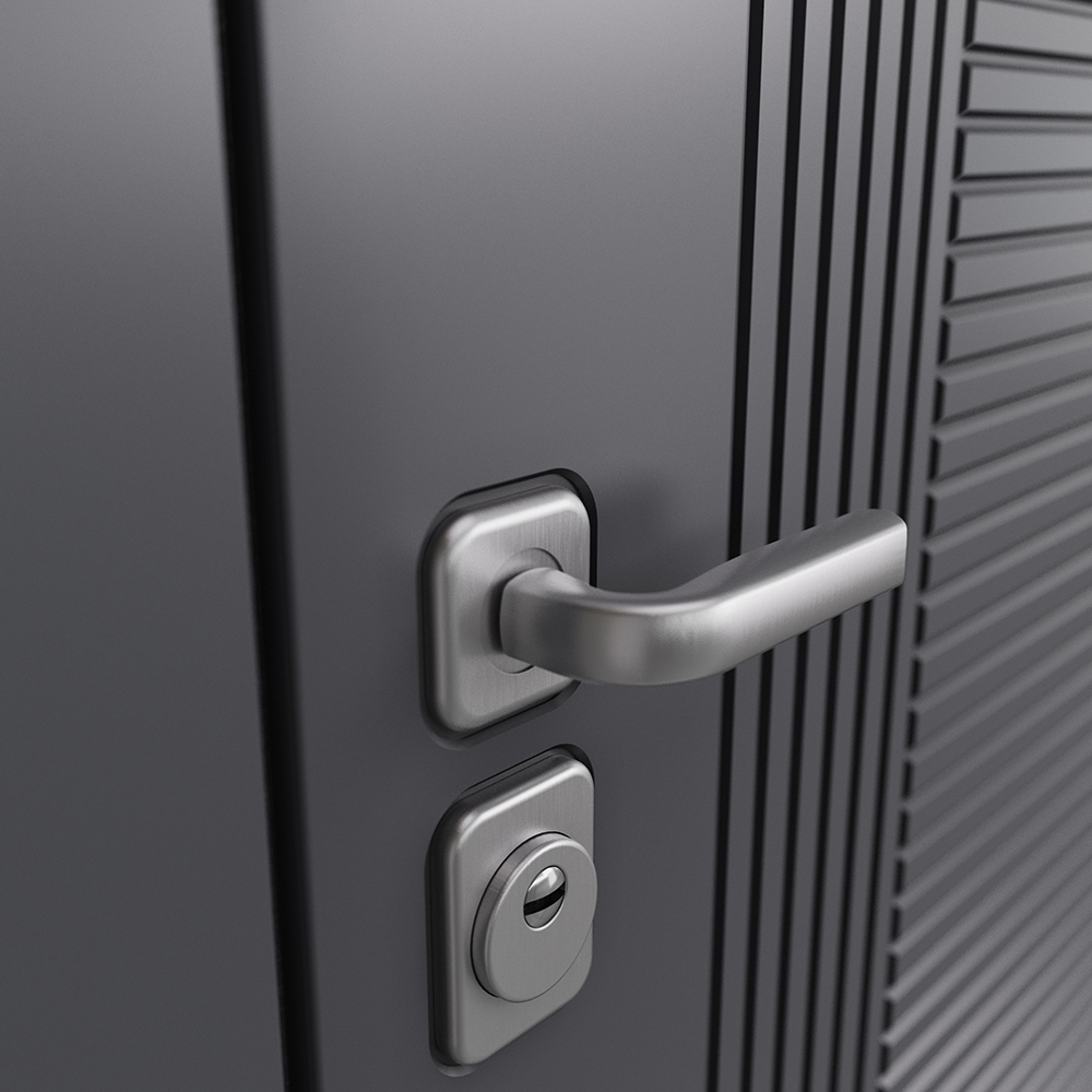 Наполнение - минеральная плита высокой плотности + пенополистирол. Предназначена для установки в жилых и общественных зданиях в качестве входной двери внутри помещения. Полотно изготовлено из стали. Стальной лист 1,4 мм с атмосферостойким порошковым покрытием цвета "Темно-серый букле графит"; с внешней отделкой МДФ в цвете "Оскуро" с декоративной отделкой; с внутренней стороны МДФ в цвете "Бьянко" + зеркало.