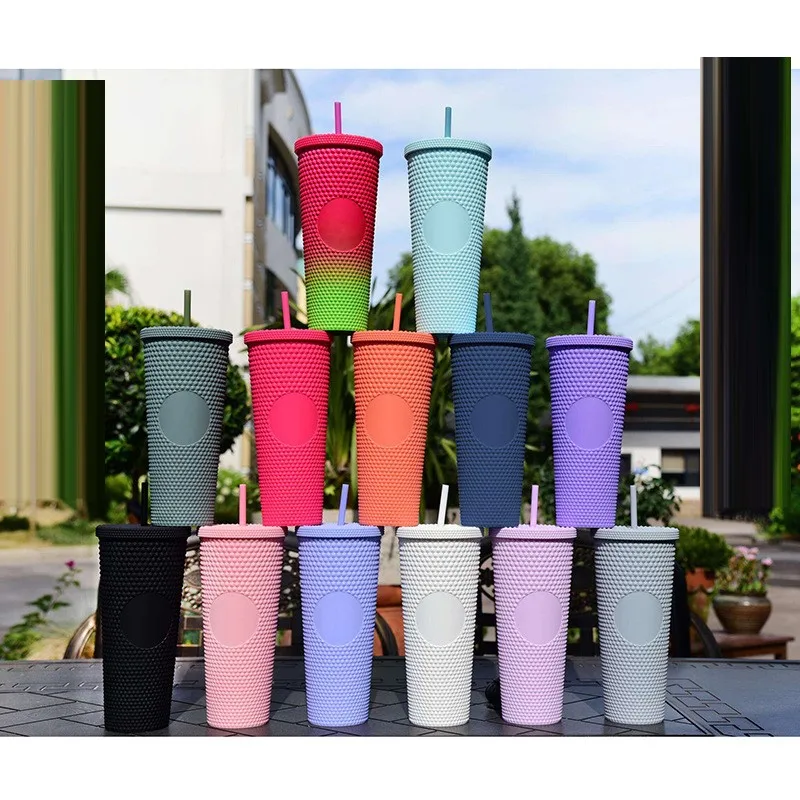 Двойная стена «сделай сам» 710 мл 24 унции, пластиковая Бриллиантовая Шипованная фотостакан, двойная дурийская солома с пластиковой чашкой