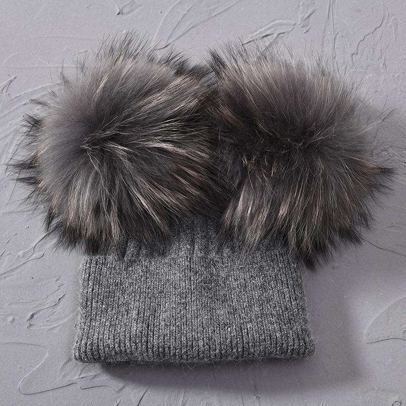 Двойная шапка с помпоном из натурального меха енота, женская зимняя шапка, вязаные шерстяные шапки, шапки-бини для девочек, женская шапка с двумя помпонами из меха