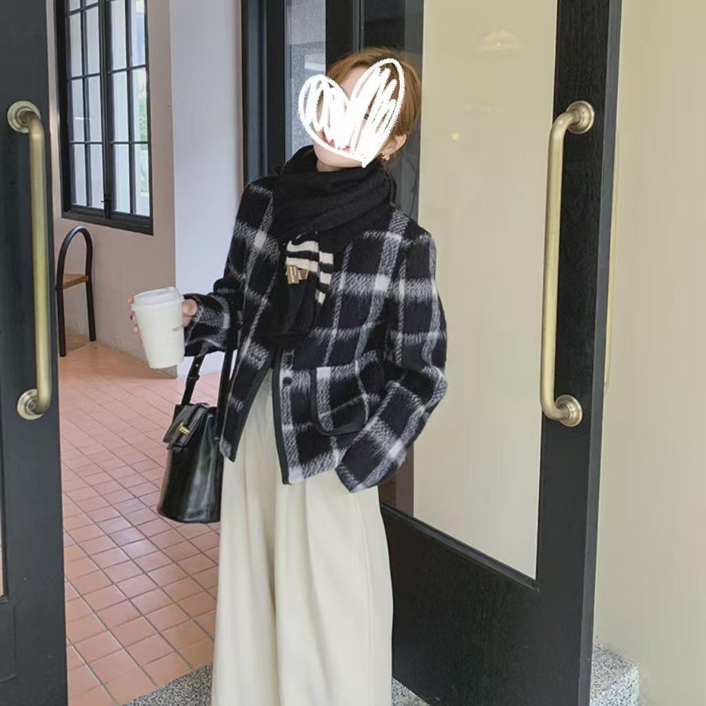 Двустороннее шерстяное пальто Xiaoxiangfeng, женское, черно-белое, клетчатое, короткое, замедляющее старение, шерстяное пальто с круглым вырезом, зимнее M чёрный