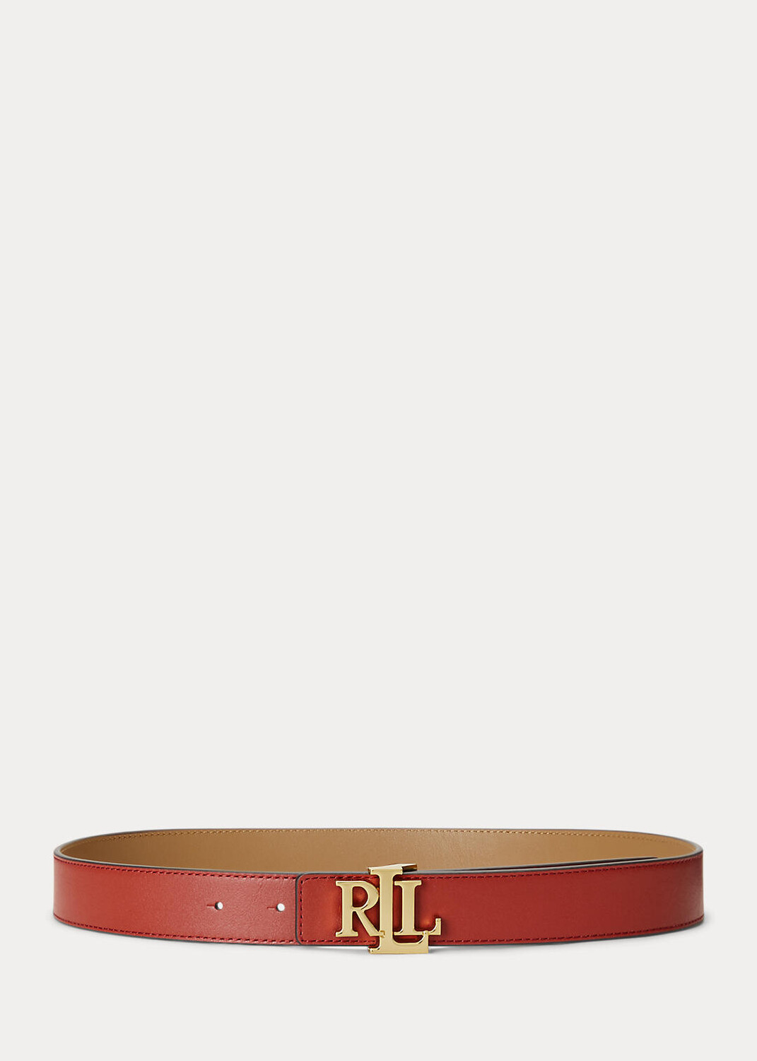 Двусторонний ремень с пряжкой LRL по центру выполнен из мягкой натуральной кожи с гладкой поверхностью.