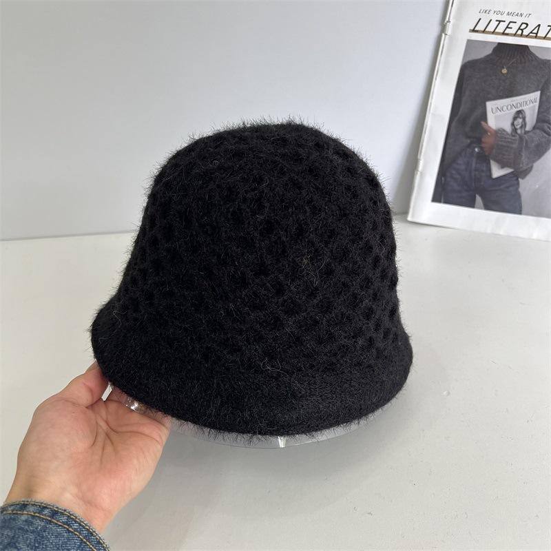 Двусторонняя вязаная панама женская зимняя большой окружности головы теплая шерстяная панама новое лицо маленькая плюшевая шляпа-ведро M(56-58cm) чёрный