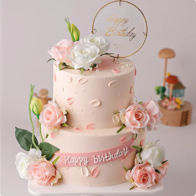 Двухслойная имитационная модель торта ко дню рождения, образцы витрины в витрине, пластик, фрукты, цветы, искусственное украшение торта