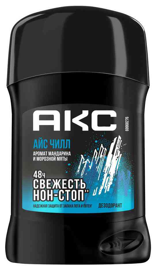 Освежающий мужской дезодорант стик Акс Айс Чилл создан специально для крутых парней, которым нужна полная уверенность в своем образе и безукоризненно стильный парфюм.Дезодорант стик из смелой линейки создан для тех, кто не боится стоять на своем, готов следовать за мечтой и привык действовать! Средство имеет свежий фужерный аромат, разработанный в сотрудничестве с одной из лучших мировых парфюмерных команд. Фишка дезодоранта для мужчин Акс – полупрозрачная текстура синего цвета на водной основе. Средство высыхает всего за 1-2 минуты после нанесения. Дезодорант Акс не оставляет белых следов' на одежде, ежедневно обеспечивает желанную свежесть коже подмышек, защищая от запаха пота весь день нон-стоп''.Цветная полупрозрачная формула стика Акс 2в1 включает в себя два основных элемента защиты. Это надежная защита от запаха пота на 48 часов'' и топовый** аромат. Запах с нотками сочных мандаринов и морозной мяты заряжает на новые подвиги. Парфюмированный твердый дезодорант мужской станет изысканным дополнением к твоей коллекции любимых средств для личной гигиены.Акс дезодорант карандаш подходит для подростков с 14 лет. Этот дезодорант имеет специально подобранный выраженный щелочной рН, который предотвращает размножение бактерий – главной причины неприятного запаха. При этом он на водной основе и не вызывает негативных ощущений на коже: покраснения, раздражения, зуда*. Дезик Акс Айс Чилл не блокирует потовые железы, не содержит солей алюминия и озоноразрушающих веществ.Дезодорант не тестируется на животных. Можно наносить каждый раз после душа. Дезики – стики хороши тем, что за счет хорошо контролируемого нанесения они обеспечивают средству более экономичный расход. Вместе с дезодорантом Акс никакие следы и пятна на одежде вам не страшны*. Твердый дезодорант Айс Чилл освежит не только твой образ, но и твои мысли!'обусловленных наличием солей алюминия,''48ч свежесть нон-стоп - 48ч тест оценки уровня неприятного запаха, 2010/2018топовый аромат - в портфеле бренда Акс"