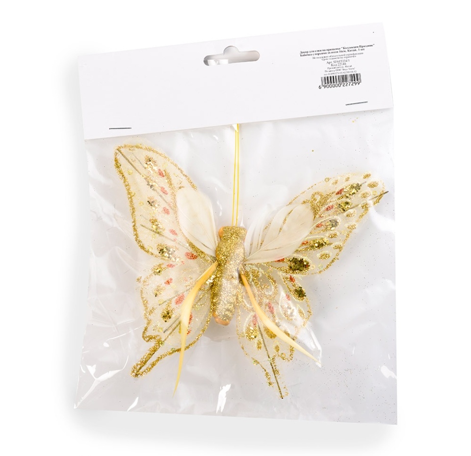 Декор для елки на прищепке "Коллекция Праздник" Бабочка с перьями золотая, 16см, Китай
