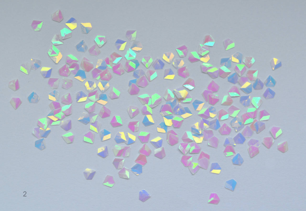 Декор для ногтей 3D Бриллиант - отличная возможность превратить обычный декоративный маникюр в роскошный "бриллиантовый" нейл-дизайн, от которого невозможно отвести глаз. Если вы ищите что-то оригинальное, необычное и яркое, тогда данный вид декора станет лучшим выбором. Его можно сочетать с лаком, гель-лаком, гелем, использовать самостоятельно и вместе с другими материалами для нейл-дизайна. 3D Бриллиант - это объем и волшебные сверкающие переливы, которые так напоминают о блеске настоящих драгоценностей! Фигурки плоские, по форме напоминают ограненный алмаз, а благодаря особенной конфигурации и иллюзии граней при попадании лучей света возникает эффект волшебного мерцания.