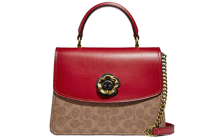 Сумка через плечо и на цепочке из телячьей кожи с покрытием из ткани, кроссбод Coach Trumpets, женская, красная, разноцветная, с монограммой
