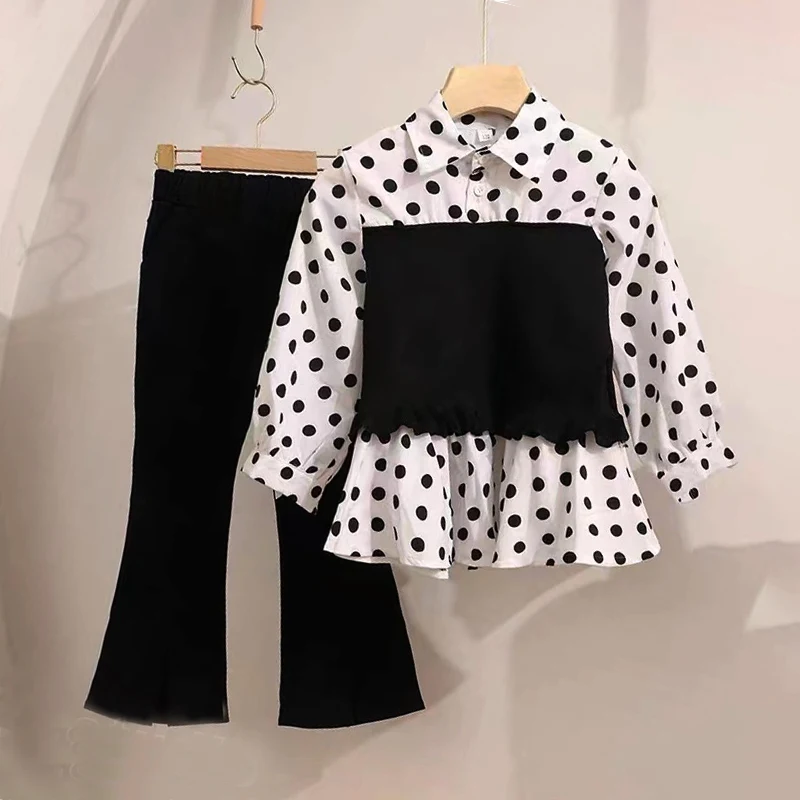 Демисезонный комплект из 2 предметов для девочек, детская блузка + расклешенные брюки, детские костюмы, детская модная одежда, трикотажная б...