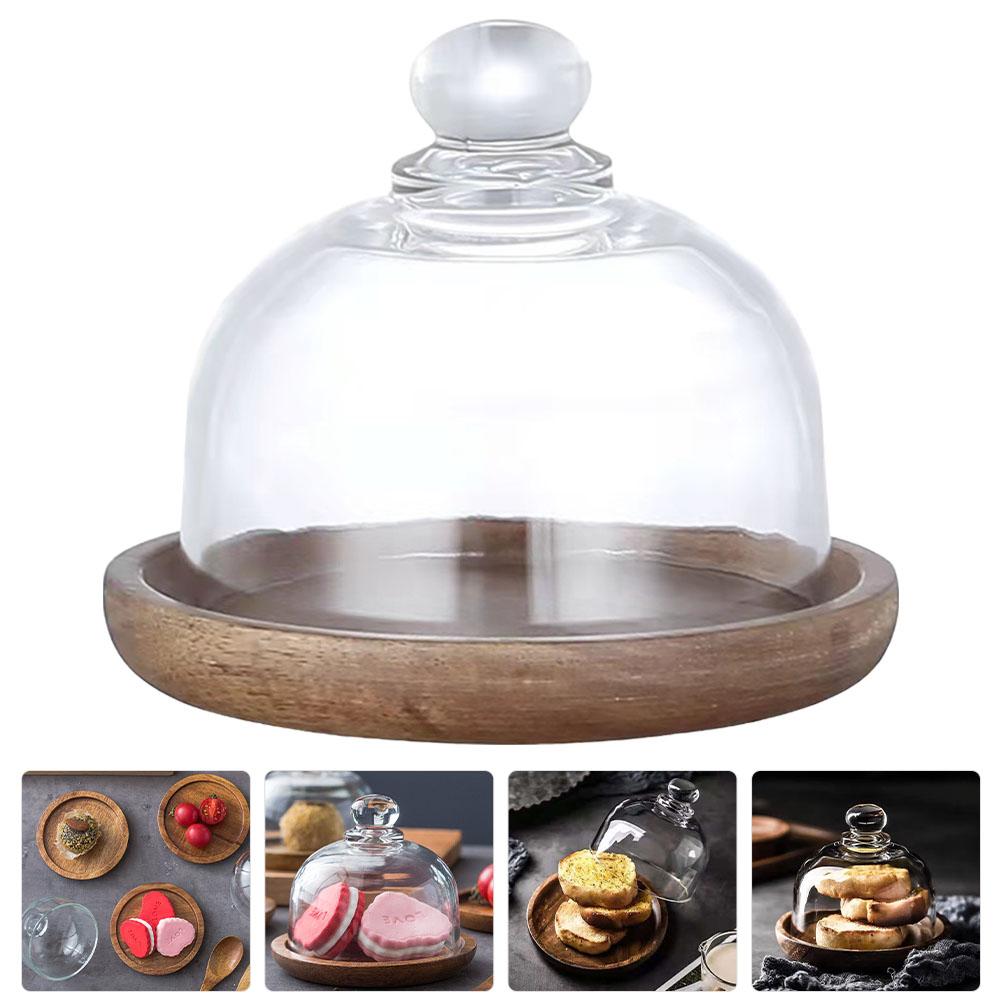 Демонстрационные полки Стеклянная крышка Поднос для выпечки Сервировочная тарелка для торта Деревянный держатель Еда с куполом Мини-десерт Многофункциональное основание