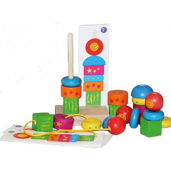 В набор входит деревянная подставка со штыком, на который необходимо надевать различные геометрические фигуры и шнурок, на который можно нанизывать разноцветные фигурки.