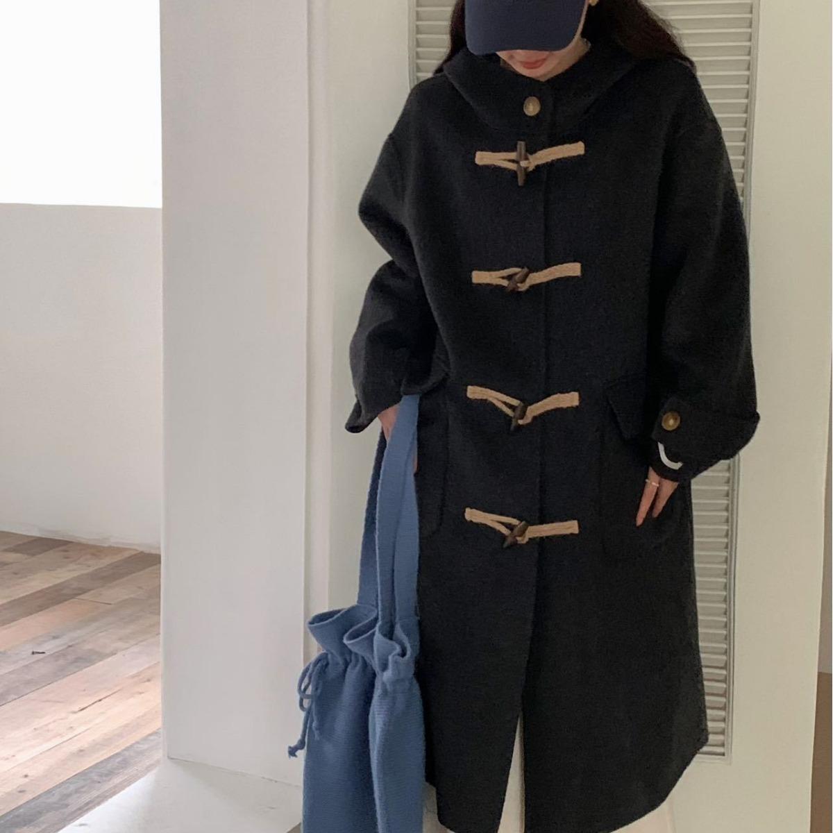 Деревянная роговая пряжка корейский стиль с капюшоном двухстороннее шерстяное пальто женское средней длины новое свободное шерстяное пальто зима M