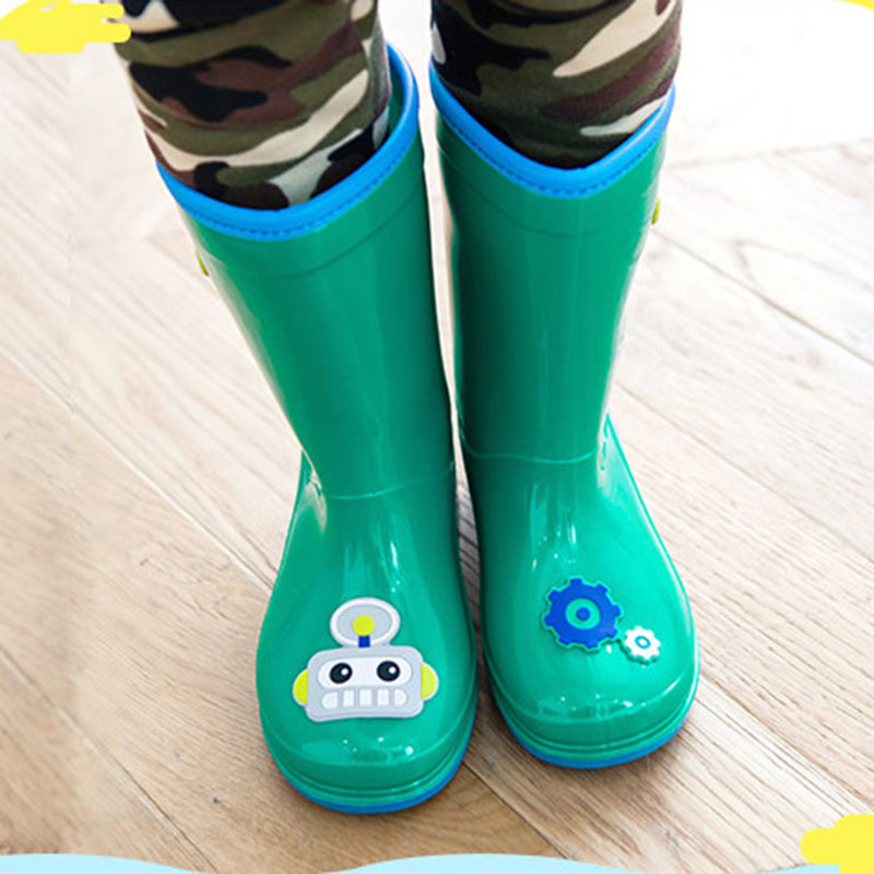 Hot Sale-Candy Color Rain Boots Cute Boy Girl Baby Kids Recorder Robots Printing Waterproof Shoes 2016 New kinderen regenlaarzen Two Robots, Green
