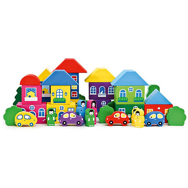 Конструктор представлен набором деревянных фигурок, благодаря которым малыш сможет самостоятельно создать свой собственный городок. Из элементов набора можно построить несколько домов с крышами, окошками, балкончиками и входными дверями. В комплект входят фигурки деревянных человечков, легковых машин и деревьев.