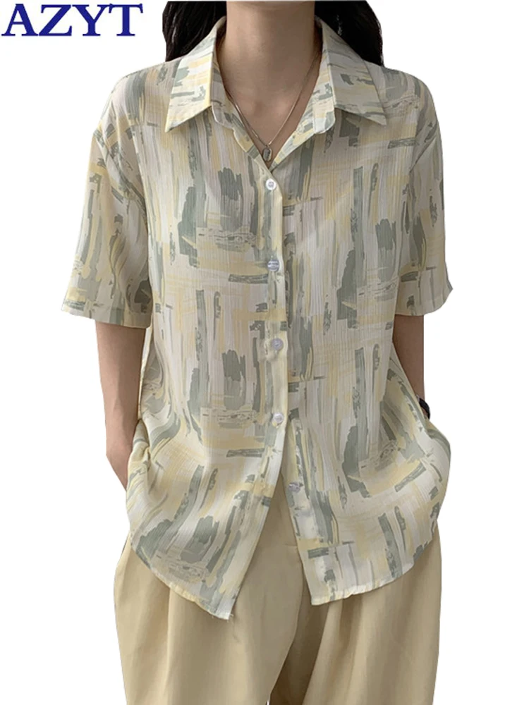 AZYT Fashion Print Short Sleeve Blouses Women 2022 Summer Turn Down Collar Casual Blusas Mujer Tops Loose Women's Shirt
