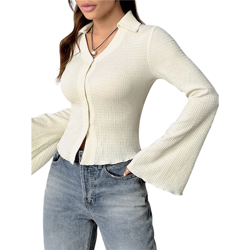 ABRT-Женская повседневная блузка на пуговицах с длинными рукавами-колокольчиками, рубашка с салатным воротником, рабочая блузка