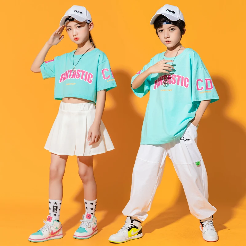 Детская Одежда для танцев в стиле хип-хоп, футболка, Топы, уличная одежда, белые брюки, юбка, мини для девочек и мальчиков, костюм для джазовых танцев, одежда