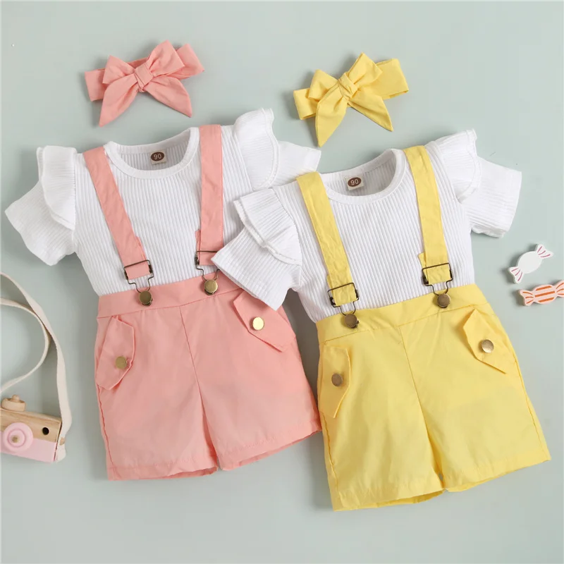 Детская летняя одежда для девочек, Однотонная футболка с оборками и коротким рукавом и повседневные шорты на бретелях, комплект с повязкой ...
