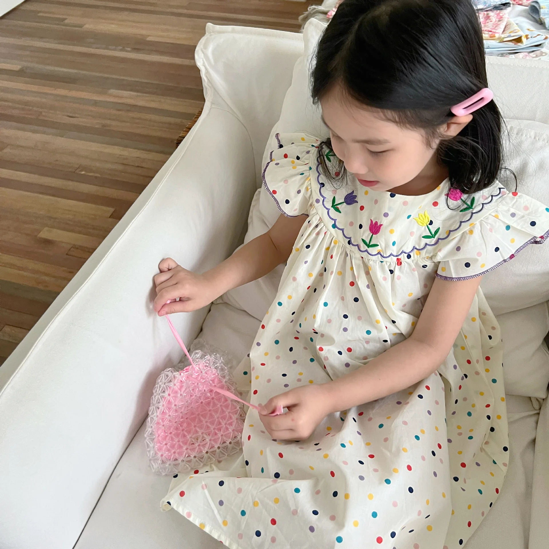 Детская одежда, платье с вышивкой для девочек, Новинка лета 2023, модное милое платье в красочный горошек с цветами для девочек