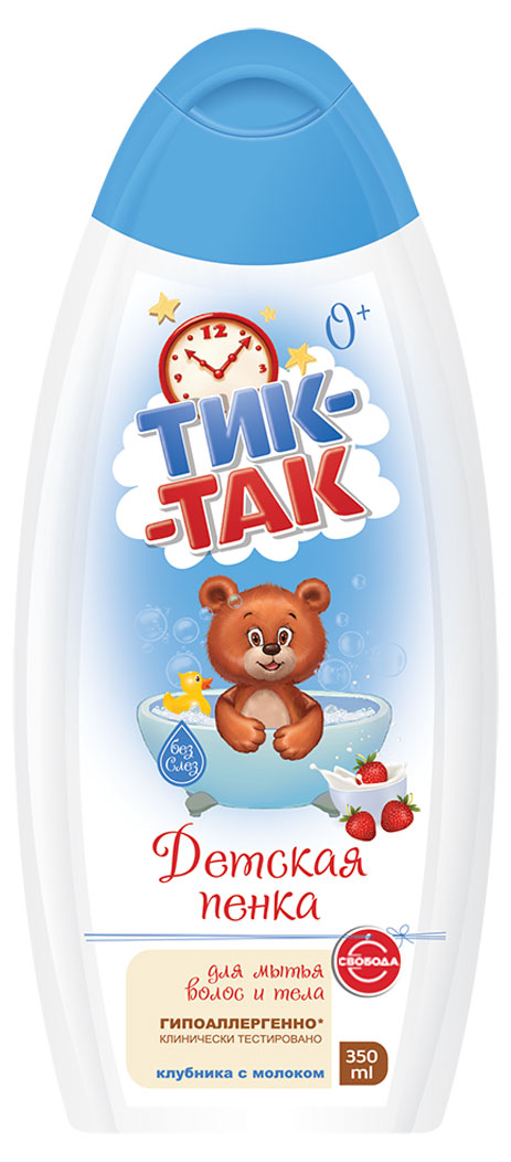 Детская пенка для мытья волос и тела Тик-Так клубника с молоком 0+, 350 мл
