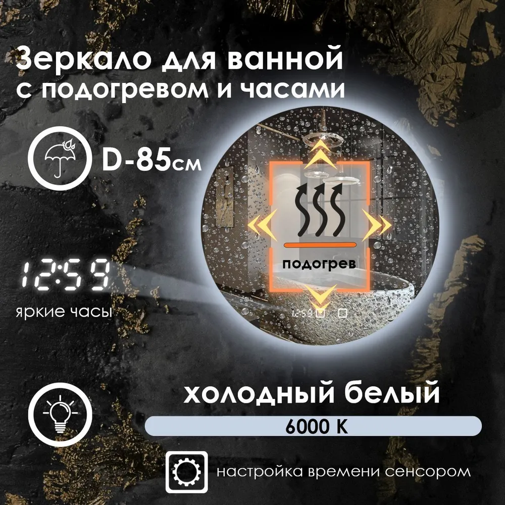 Зеркало для ванной Maskota Villanelle с часами,подогревом и контурной подсветкой 6000, D85, Белый, Vil-st/6000/clock/hot